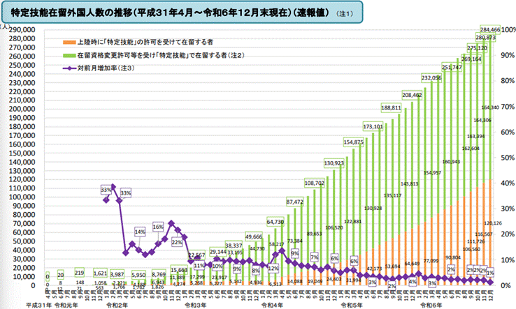 特定技能の在留資格で日本に滞在する外国人の数は、制度が始まってから順調に増加し続けています。令和6年(2024年)12月末時点では約28万4千人に達し、過去最高を更新しました。