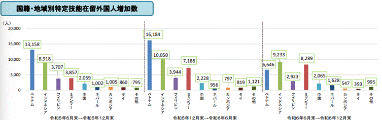 以下のデータは、国籍・地域別の特定技能在留外国人数と増加数を示したものです。